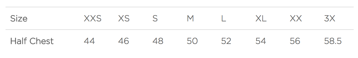 | Half Chest | 45 | 48.5 | 51 | 53.5 | 56 | 58.5 | 61 | 63.5 |