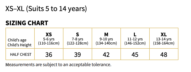 | Half Chest (cm) | 36 | 39 | 42 | 45 | 48 |
